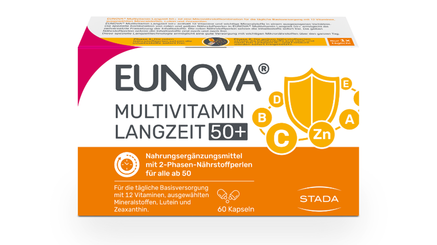 Für die Nahrungsergänzung bei Menschen ab 50 Jahren wurde EUNOVA® Langzeit 50+ entwickelt. Neben der Eunova-Langzeit-Technologie verfügt das Produkt auch über ein Plus an pflanzlichen Antioxidantien. EUNOVA® Langzeit 50+ enthält neben allen wichtigen Vitaminen, Mineralstoffen und Spurenelementen auch Lutein und Lycopin, die zu den Carotinoiden gehören. Lutein, Lycopin und Vitamin E sind hoch dosiert. Durch die Eunova-Langzeit-Technologie werden fast alle wasserlöslichen Vitamine über mehrere Stunden nach und nach freigesetzt. Lediglich bei Vitamin B12 und Folsäure wurde bewusst auf eine zeitverzögerte Freisetzung verzichtet, um eine optimale Aufnahme zu gewährleisten.