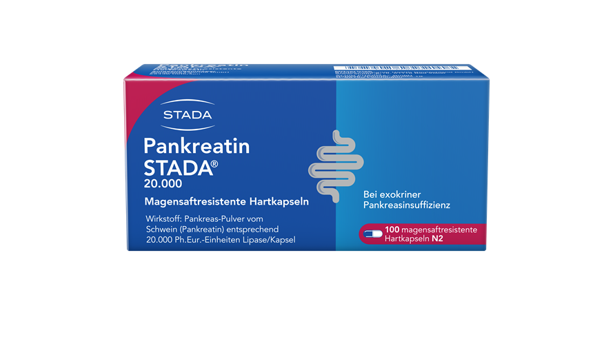 Wirkstoff: Pankreas-Pulver vom Schwein (Pankreatin) entsprechend 20.000 Ph.Eur.-Einheiten Lipase/Kapsel. Wird zur Behandlung einer exokrinen Pankreasinsuffizienz angewendet. Hierbei produziert die Bauchspeicheldrüse nicht genügend Enzyme, um die Nahrung zu verdauen. Pankreatin STADA® kann bei Kindern, Jugendlichen und Erwachsenen angewendet werden. Die Behandlung mit Pankreatin STADA® verbessert die Symptome der exokrinen Pankreasinsuffizienz, einschließlich Stuhlkonsistenz (z.B. fettiger Stuhl), Bauchschmerzen, Flatulenz und Stuhlfrequenz (Durchfall oder Verstopfung). Wenn Sie sich nach 5 Tagen nicht besser oder gar schlechter fühlen, wenden Sie sich an Ihren Arzt.